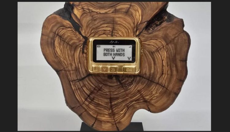 The golden pager’s screen reads, “Press with both hands.” Below the pager, which is set against a wooden background, is a plaque that reads: “To President Donald J. Trump, Our greatest friend and ally. Prime Minister Benjamin Netanyahu.” Pictures of the gift appeared in various media outlets Thursday, including CNN.